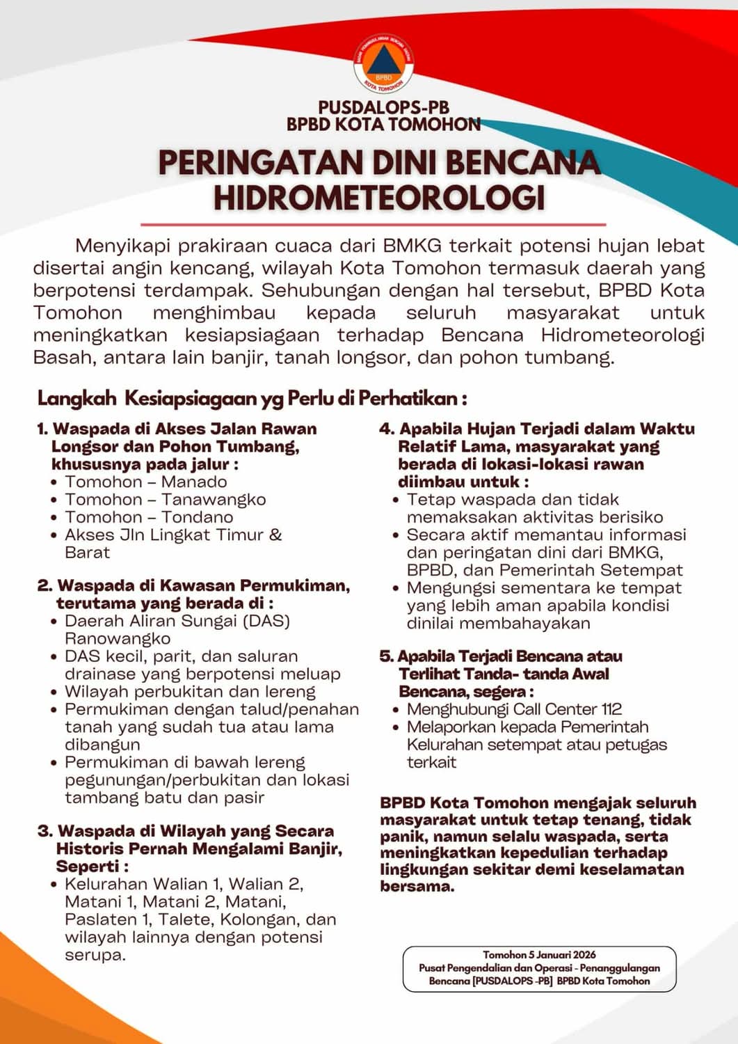 Peringatan ini dikeluarkan menyusul rilis prakiraan cuaca dari BMKG yang menyebutkan potensi hujan lebat disertai angin kencang di wilayah Sulawesi Utara, termasuk Kota Tomohon.